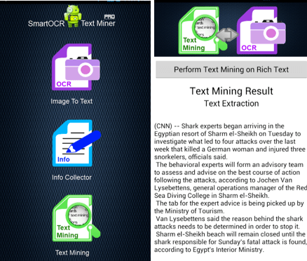 Smart OCR: Text Miner Pro is another app, concerned with text analysis. The program provides info recaps via processing images and pdf files, extracts the needed data from unstructured texts and web pages. To get use of Text Miner Pro, check the Google Play.