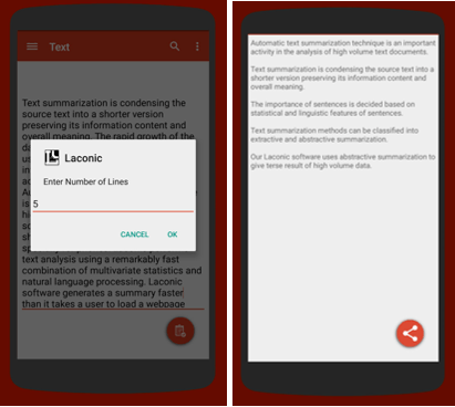 Laconic-Summary Maker shortens the relevant text and provides the general idea and key points thanks to extractive and abstractive summarization methods. With this app you will also obtain fast access to news and surveys summaries. The text for analysis can be copy-pasted from any web page or downloaded from your device. Moreover, the user will have a chance to share the generated synopsis.