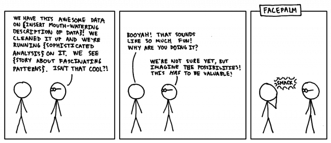 But in the bigger picture, there are more important things to consider. The by far biggest issue I see is data science solving irrelevant problems. This is a huge waste of time and energy. The reason is typically that whoever has the problem is lacking data science understanding to even express the issue and data scientists end up solving whatever they understood might be be the problem, ultimately creating a solution that is not really helpful (and often far too complicated). A typical category are ‘underdefined’ tasks: “Find actionable insights in this dataset!”. Well - most data scientists do not know which actions can be taken. They also do not know what insights are trivial vs. interesting. So there is really no point sending them on a wild goose chase.